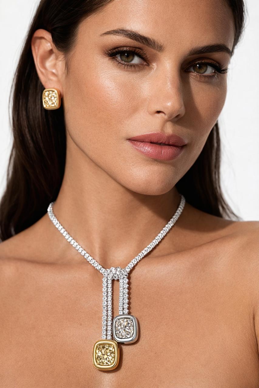 This necklace is all about contrast, balance, and quiet confidence. The Dual Legacy Necklace features two bezel-set lab-grown diamonds, one in warm yellow gold, the other in cool white gold, suspended from a fluid diamond-set chain that moves naturally with the body.