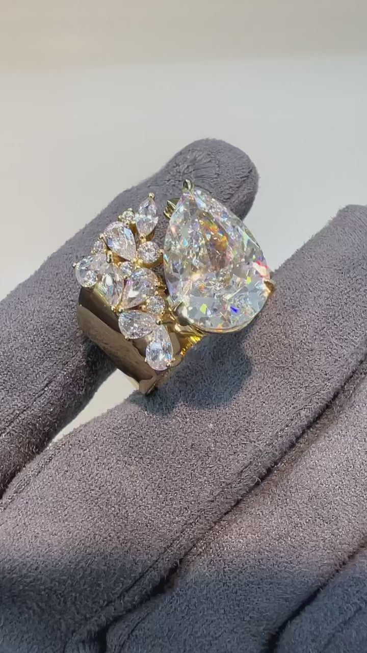 Delicate yet commanding, the Crowned Dewdrop Ring is an ode to elegance shaped by light. Featuring a striking five-carat pear-cut lab-grown diamond, this design captures the purity of a dewdrop suspended at dawn, luminous, rare, and perfectly balanced.