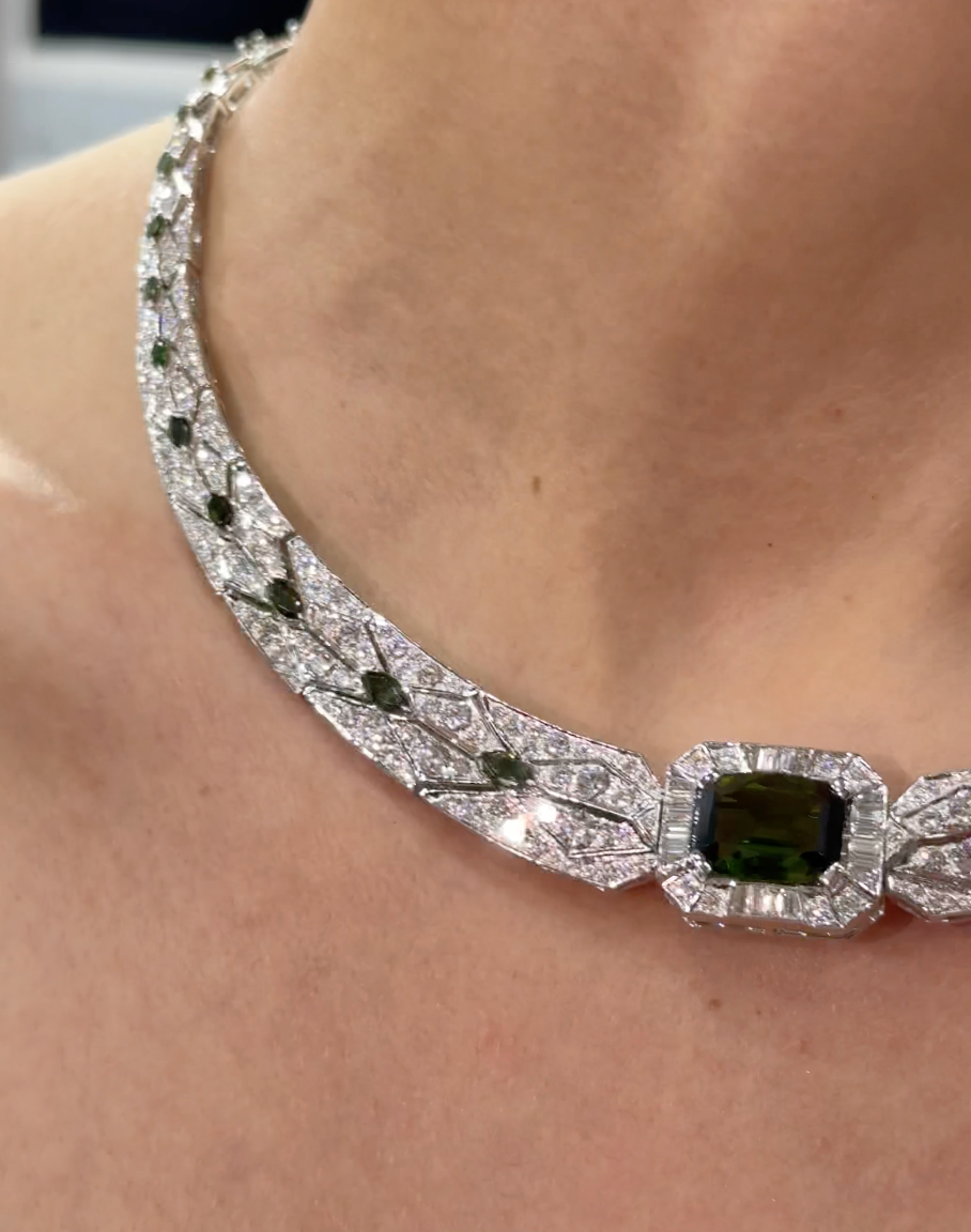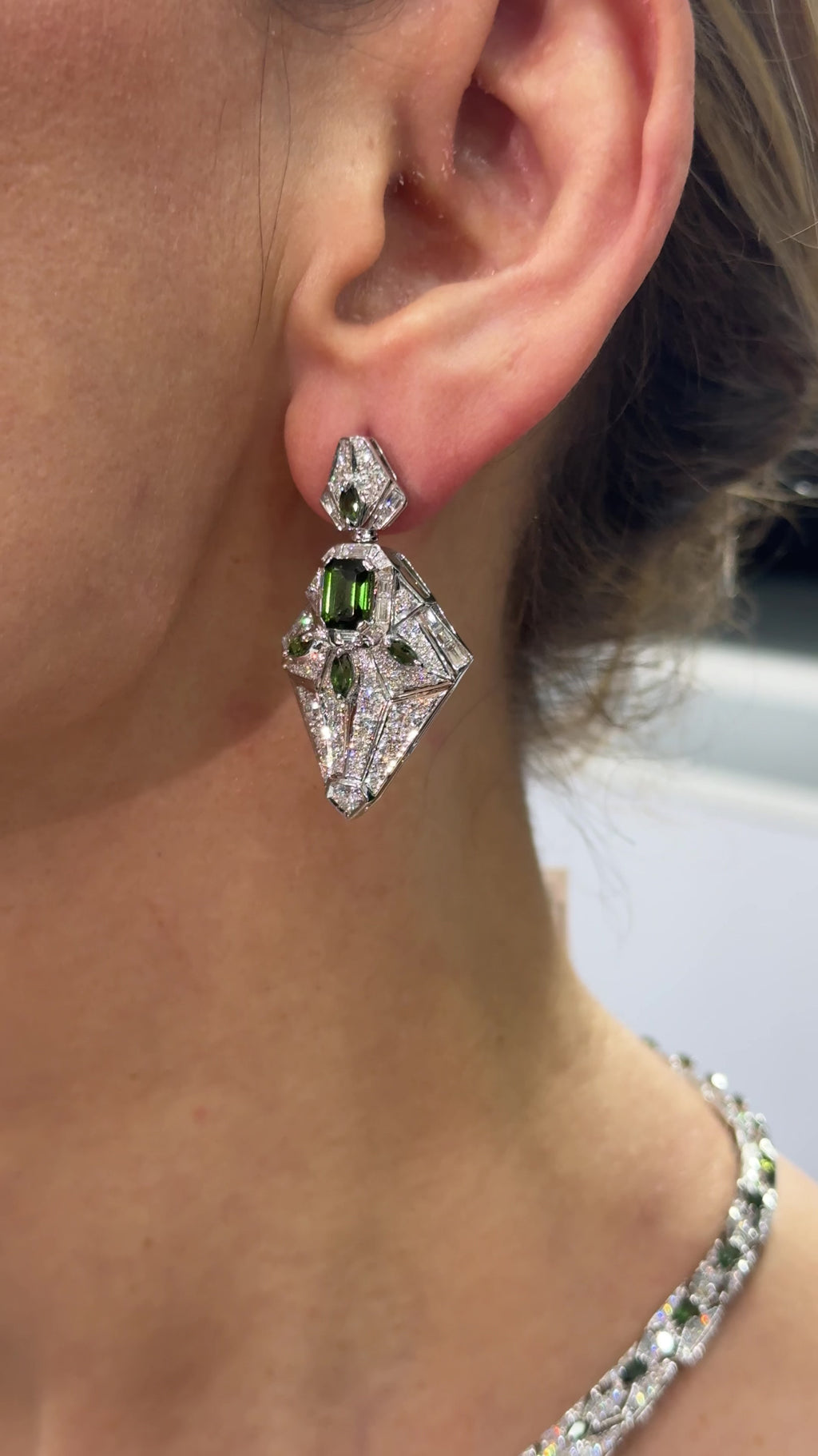 Crafted in luxurious gold, the necklace and earrings exude poise and brilliance. Each facet reflects meticulous craftsmanship and the allure of precious gemstones in perfect balance. The deep green of the tourmaline lends a regal vitality, while the diamonds illuminate every curve with celestial fire.
