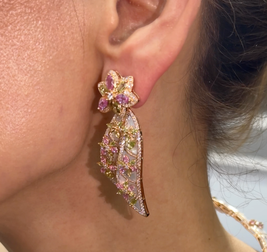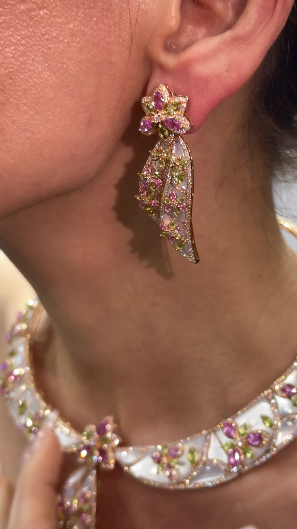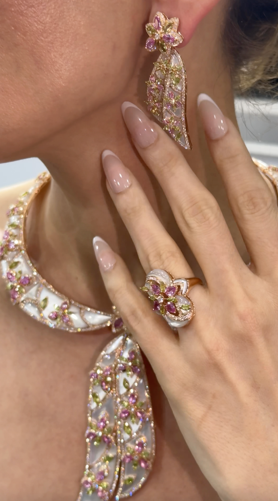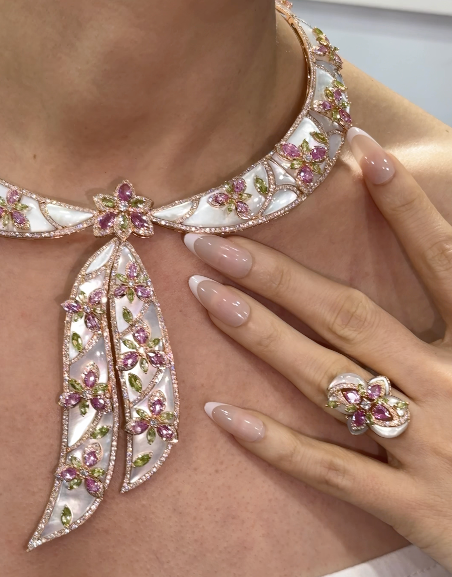 The design unfolds like a modern masterpiece. Mother of pearl meets the delicate hues of pink sapphire and peridot, creating a symphony of colour that feels regal and romantic. Set in gleaming gold and accentuated with hand-selected natural diamonds, the suite reflects exceptional craftsmanship and an exquisite balance of vibrancy and grace.