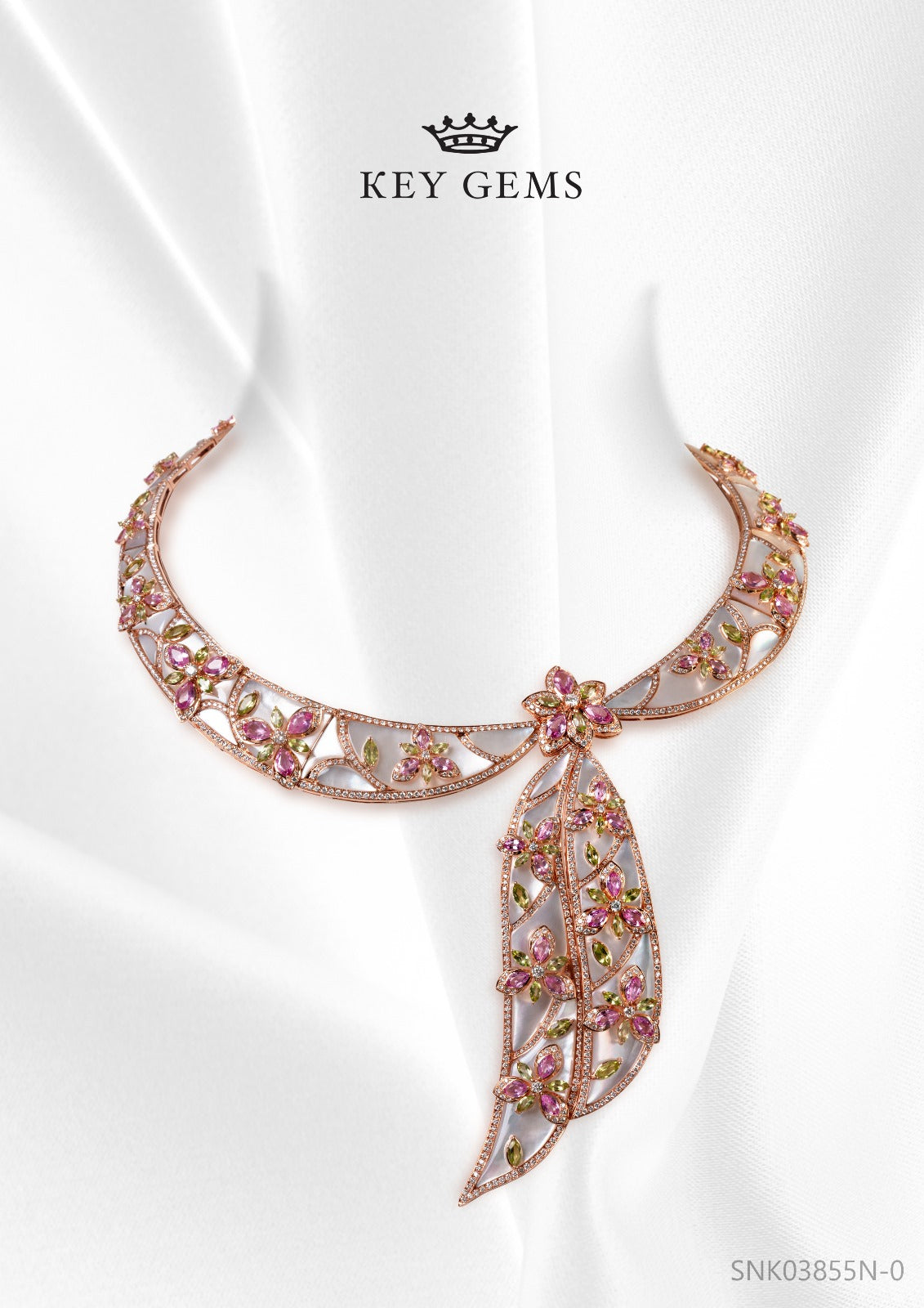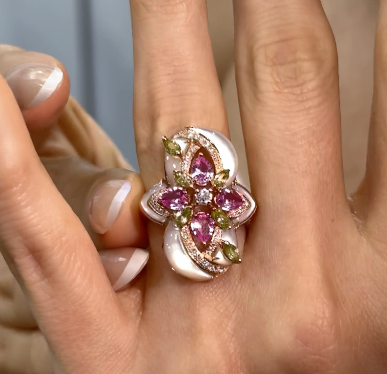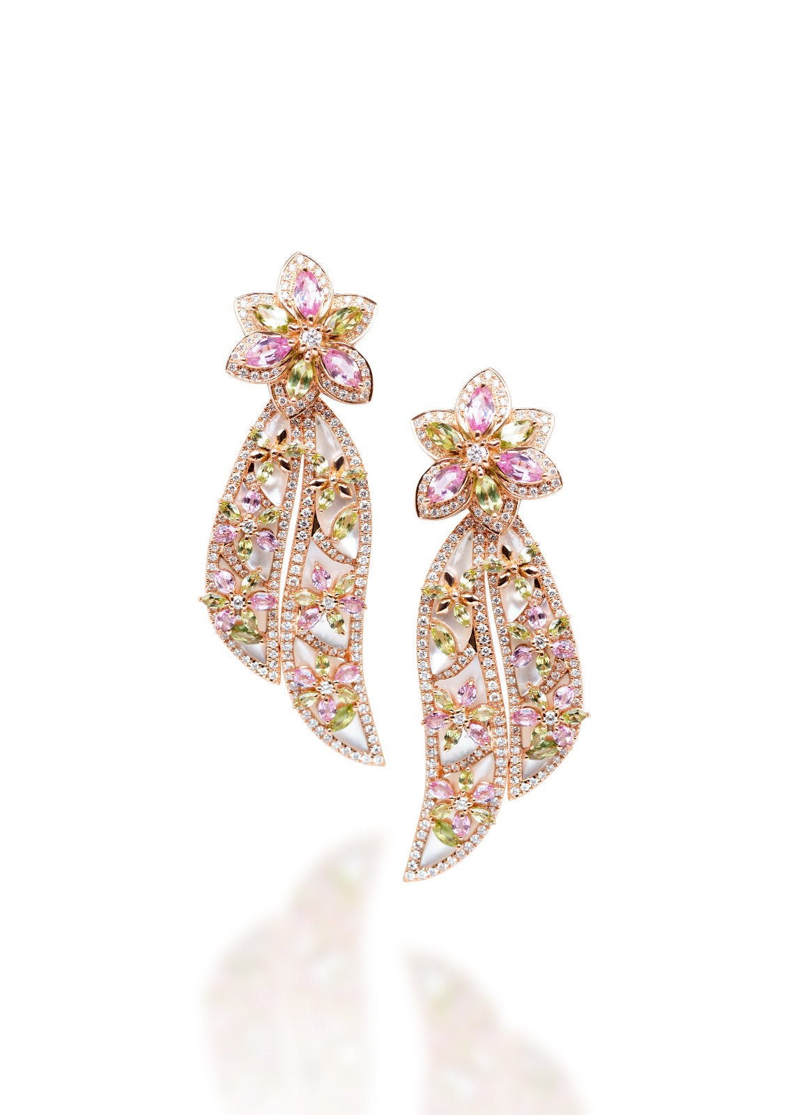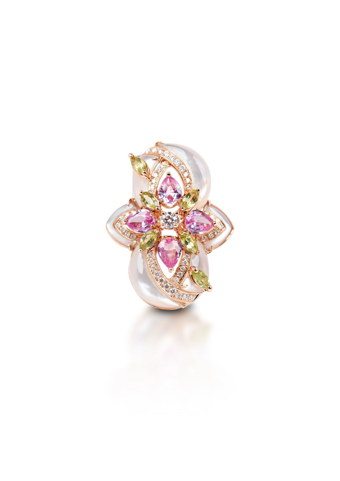 The design unfolds like a modern masterpiece. Mother of pearl meets the delicate hues of pink sapphire and peridot, creating a symphony of colour that feels regal and romantic. Set in gleaming gold and accentuated with hand-selected natural diamonds, the suite reflects exceptional craftsmanship and an exquisite balance of vibrancy and grace.