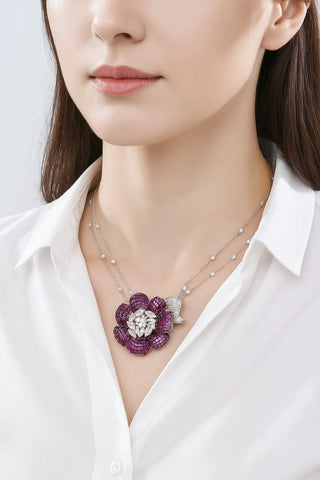 Belle's Rose Necklace with pink lab sapphire rose pendant on short sterling silver chain – romantic rose necklace for women